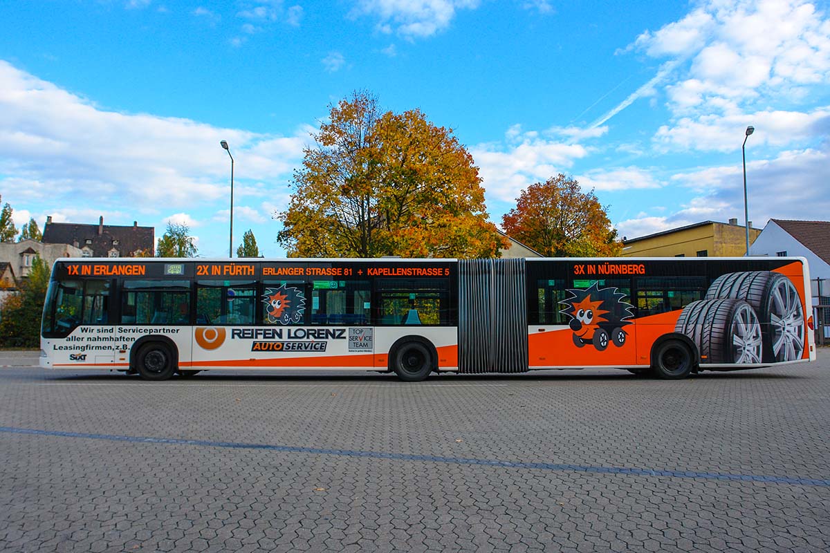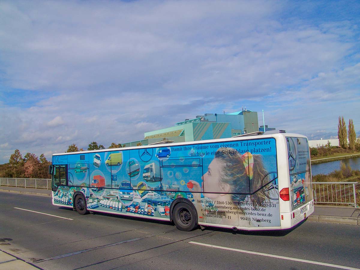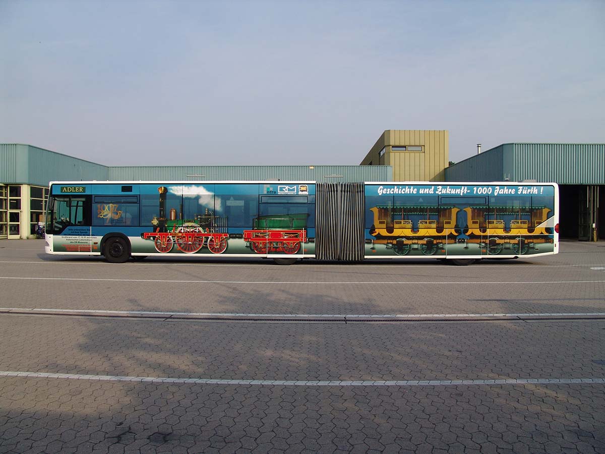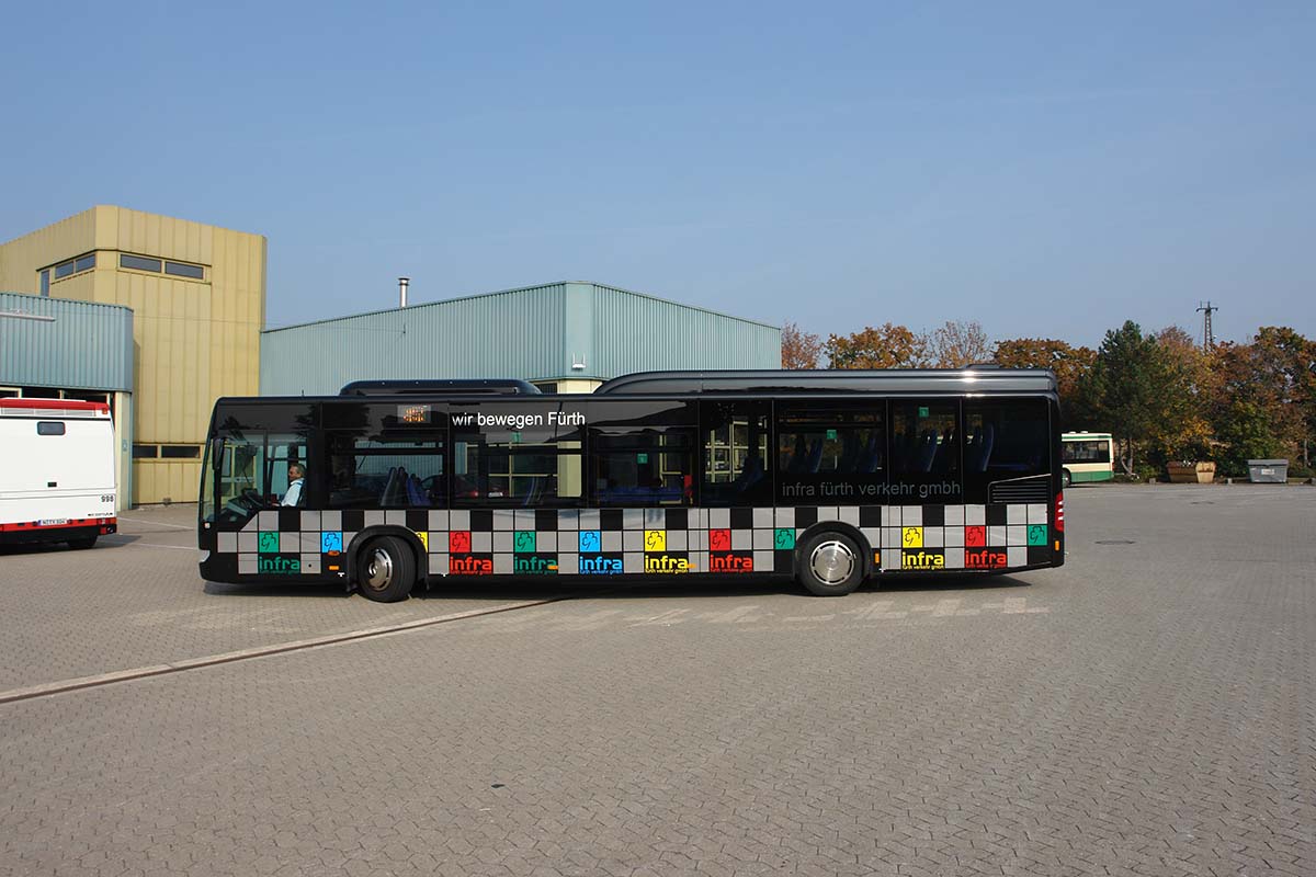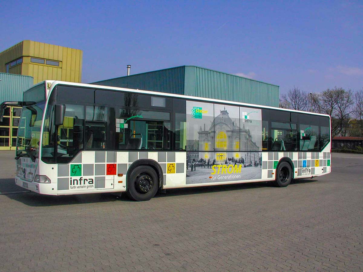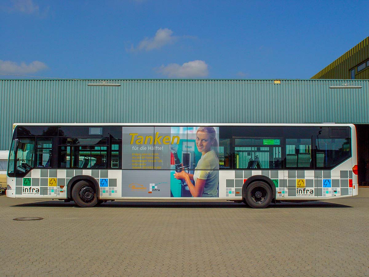 Seit Jahren ist unser Spezialgebiet die Busgestaltung und Beschriftung, insbesondere für den regionalen ÖPNV, der Infra Fürth und den Verkehrsverbund Großraum Nürnberg (VGN). Omnibusmodelle wie MAN, Setra, Mercedes oder Solaris wurden von uns bereits vielfach verklebt. Höchste Qualität der Folien und der Beklebung garantieren eine langfristige Haltbarkeit der Folienbeschriftungen.