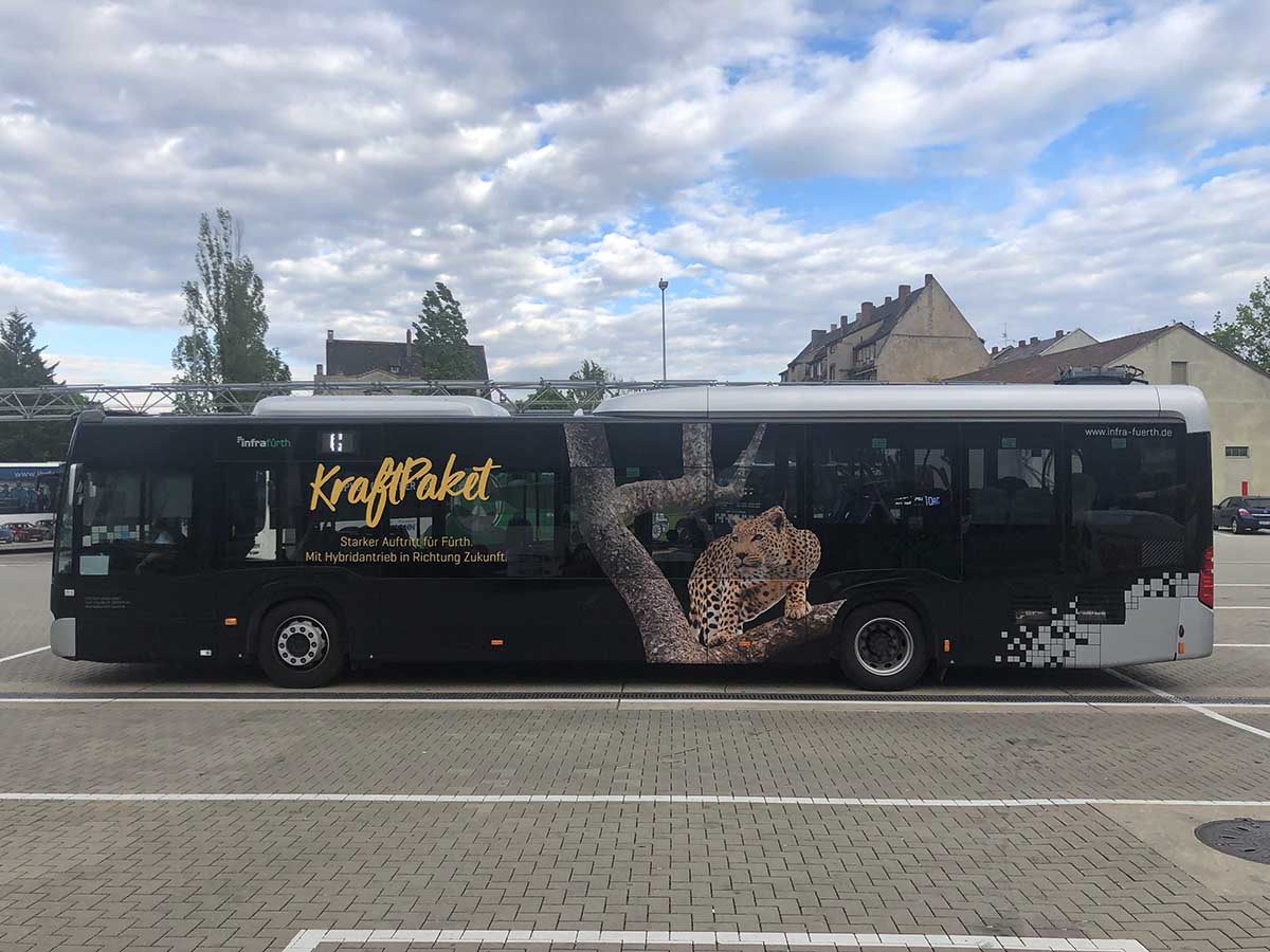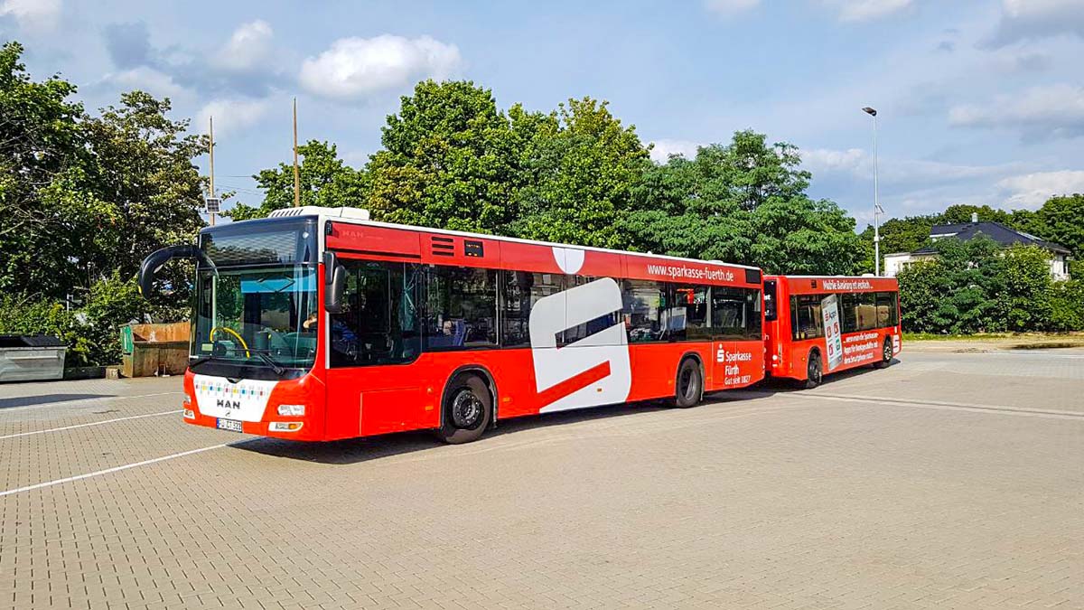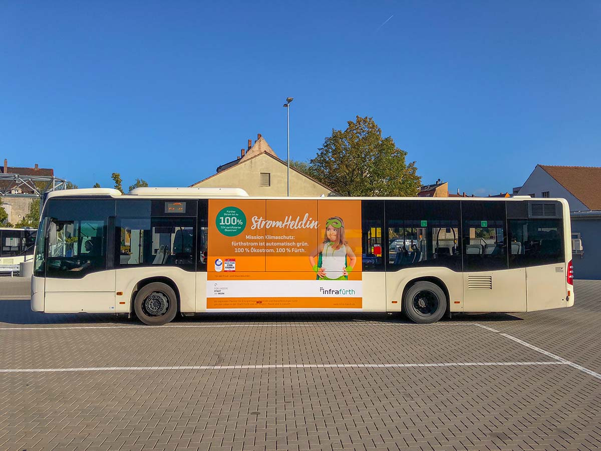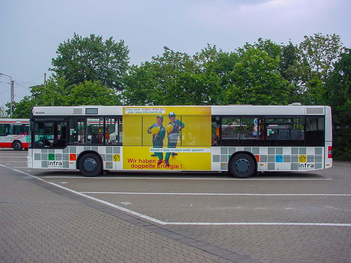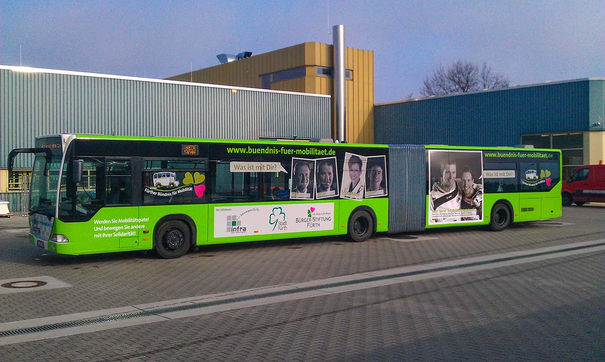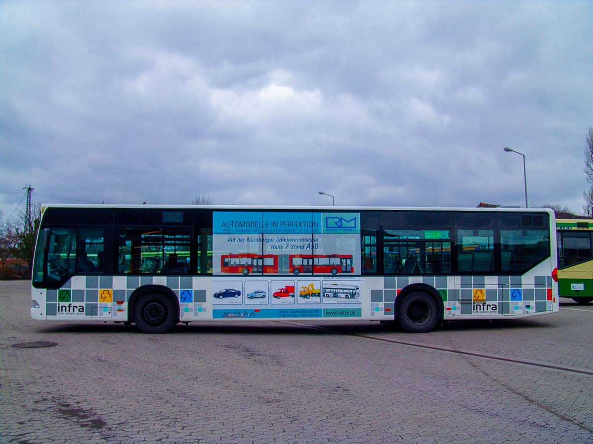 Seit Jahren ist unser Spezialgebiet die Busgestaltung und Beschriftung, insbesondere für den regionalen ÖPNV, der Infra Fürth und den Verkehrsverbund Großraum Nürnberg (VGN). Omnibusmodelle wie MAN, Setra, Mercedes oder Solaris wurden von uns bereits vielfach verklebt. Höchste Qualität der Folien und der Beklebung garantieren eine langfristige Haltbarkeit der Folienbeschriftungen.