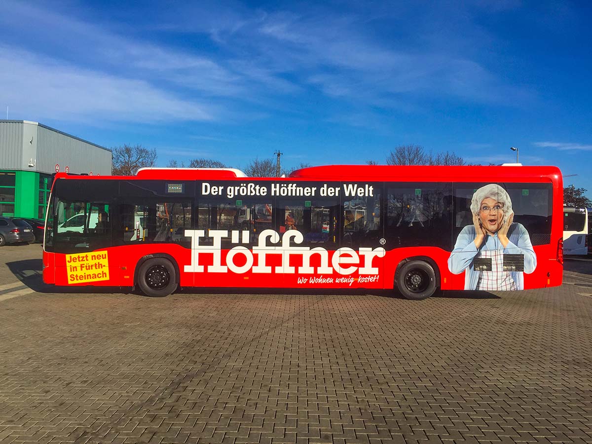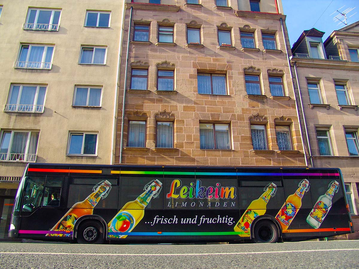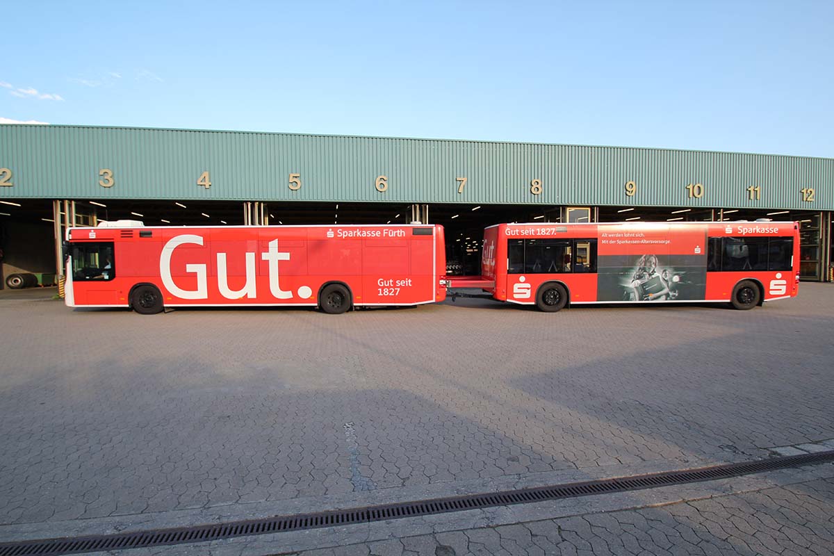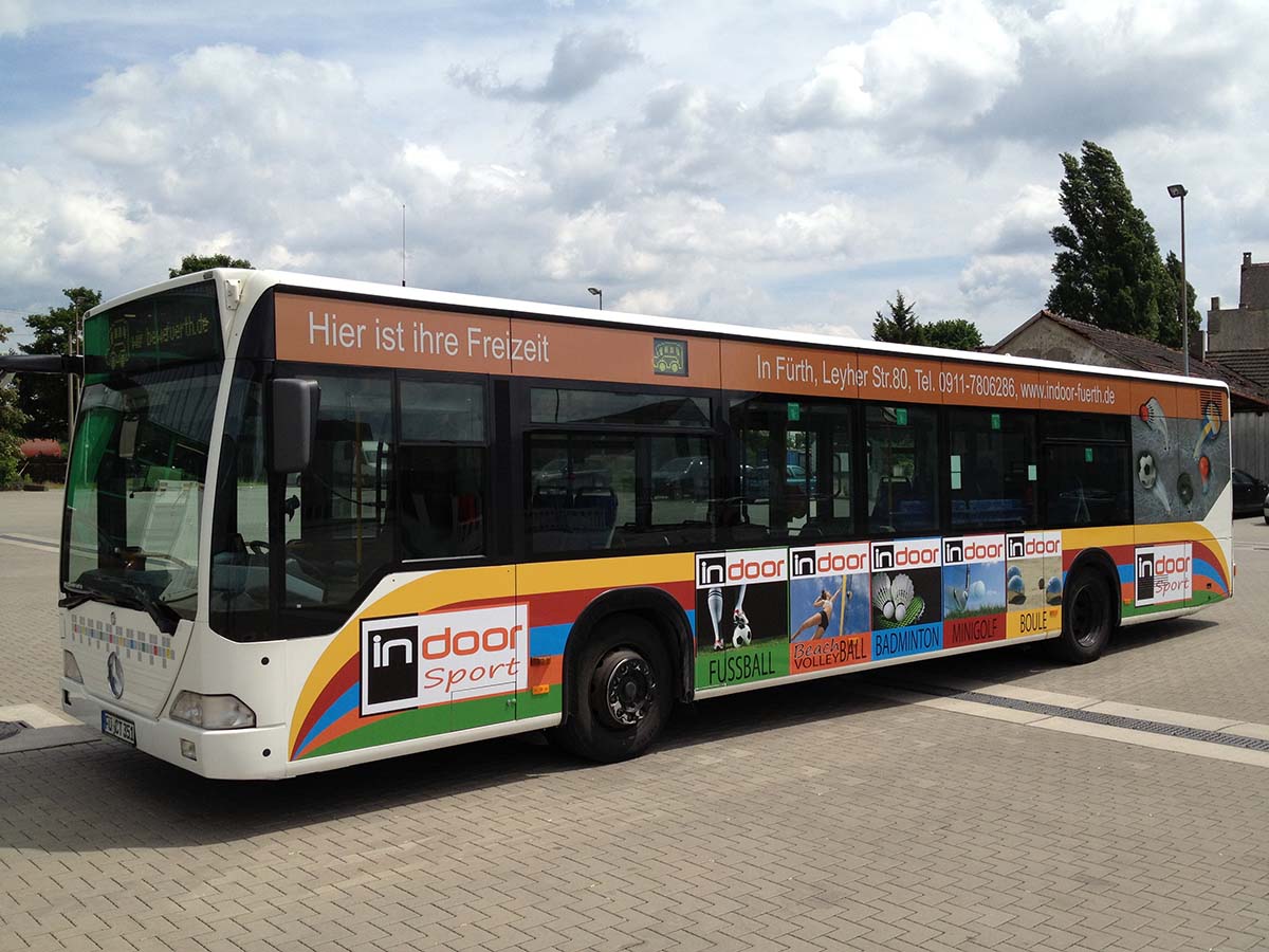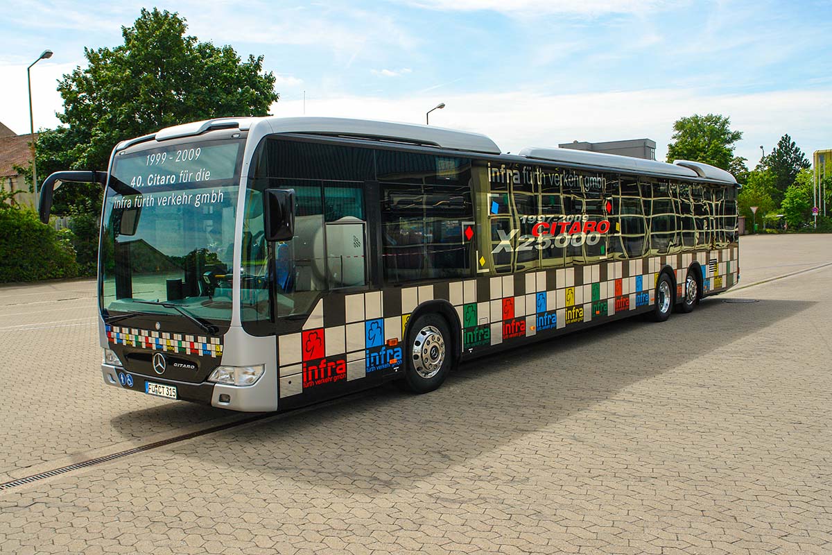 Seit Jahren ist unser Spezialgebiet die Busgestaltung und Beschriftung, insbesondere für den regionalen ÖPNV, der Infra Fürth und den Verkehrsverbund Großraum Nürnberg (VGN). Omnibusmodelle wie MAN, Setra, Mercedes oder Solaris wurden von uns bereits vielfach verklebt. Höchste Qualität der Folien und der Beklebung garantieren eine langfristige Haltbarkeit der Folienbeschriftungen.