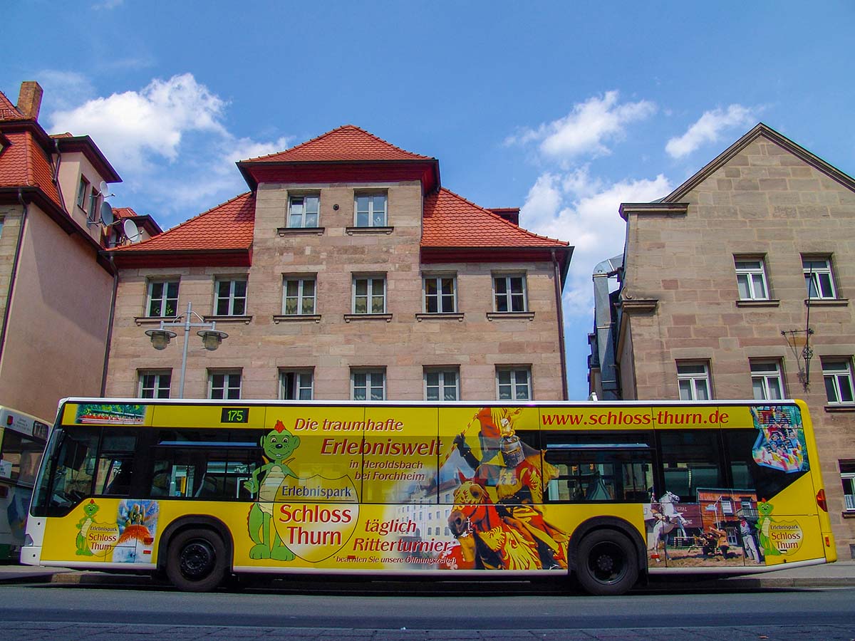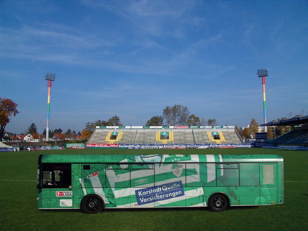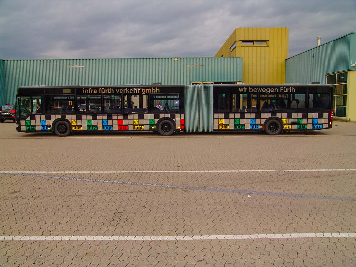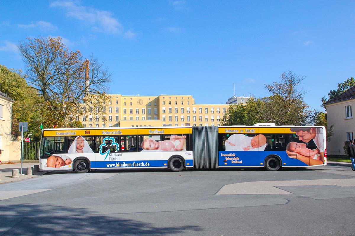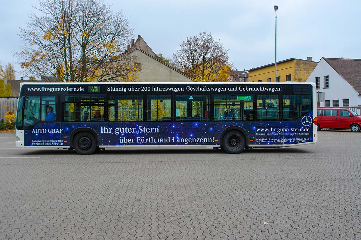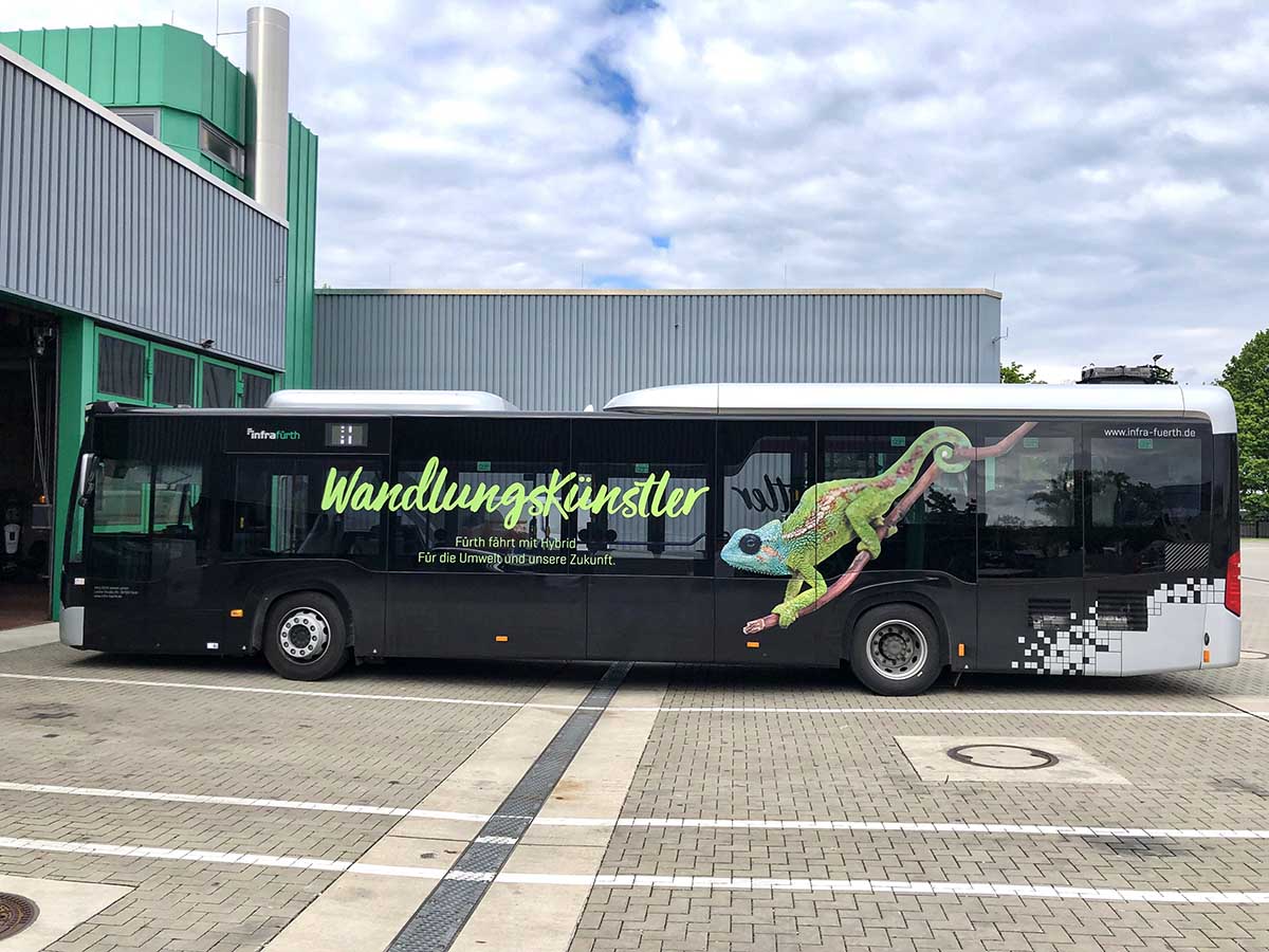 Seit Jahren ist unser Spezialgebiet die Busgestaltung und Beschriftung, insbesondere für den regionalen ÖPNV, der Infra Fürth und den Verkehrsverbund Großraum Nürnberg (VGN). Omnibusmodelle wie MAN, Setra, Mercedes oder Solaris wurden von uns bereits vielfach verklebt. Höchste Qualität der Folien und der Beklebung garantieren eine langfristige Haltbarkeit der Folienbeschriftungen.