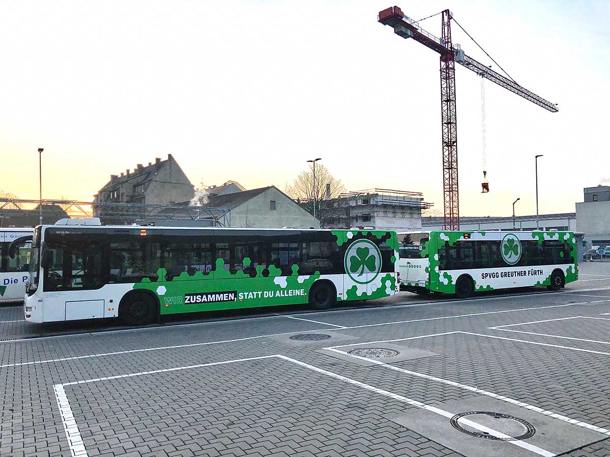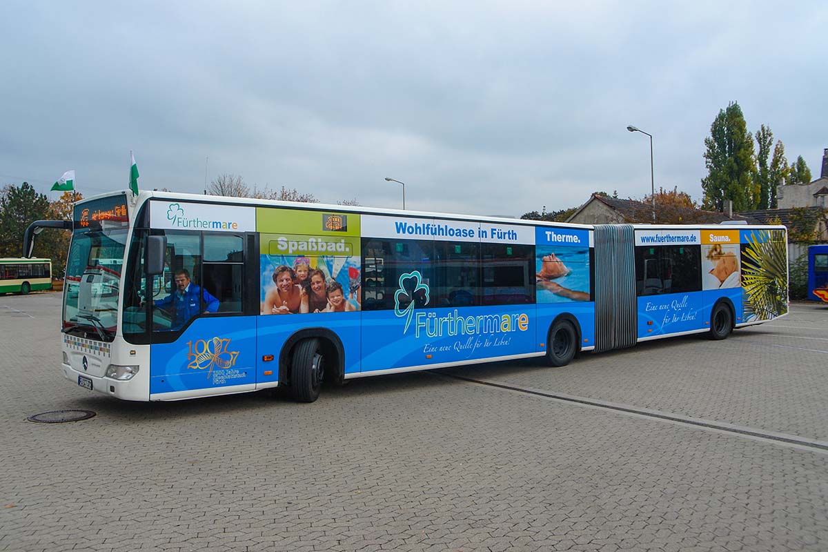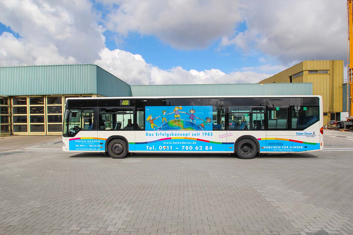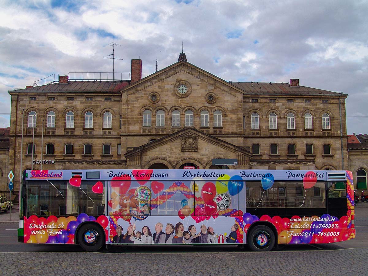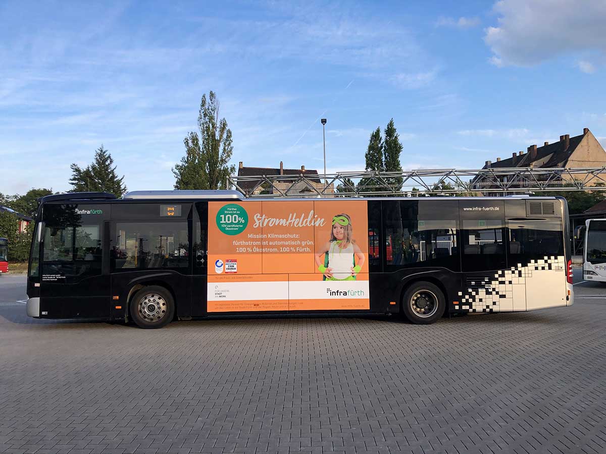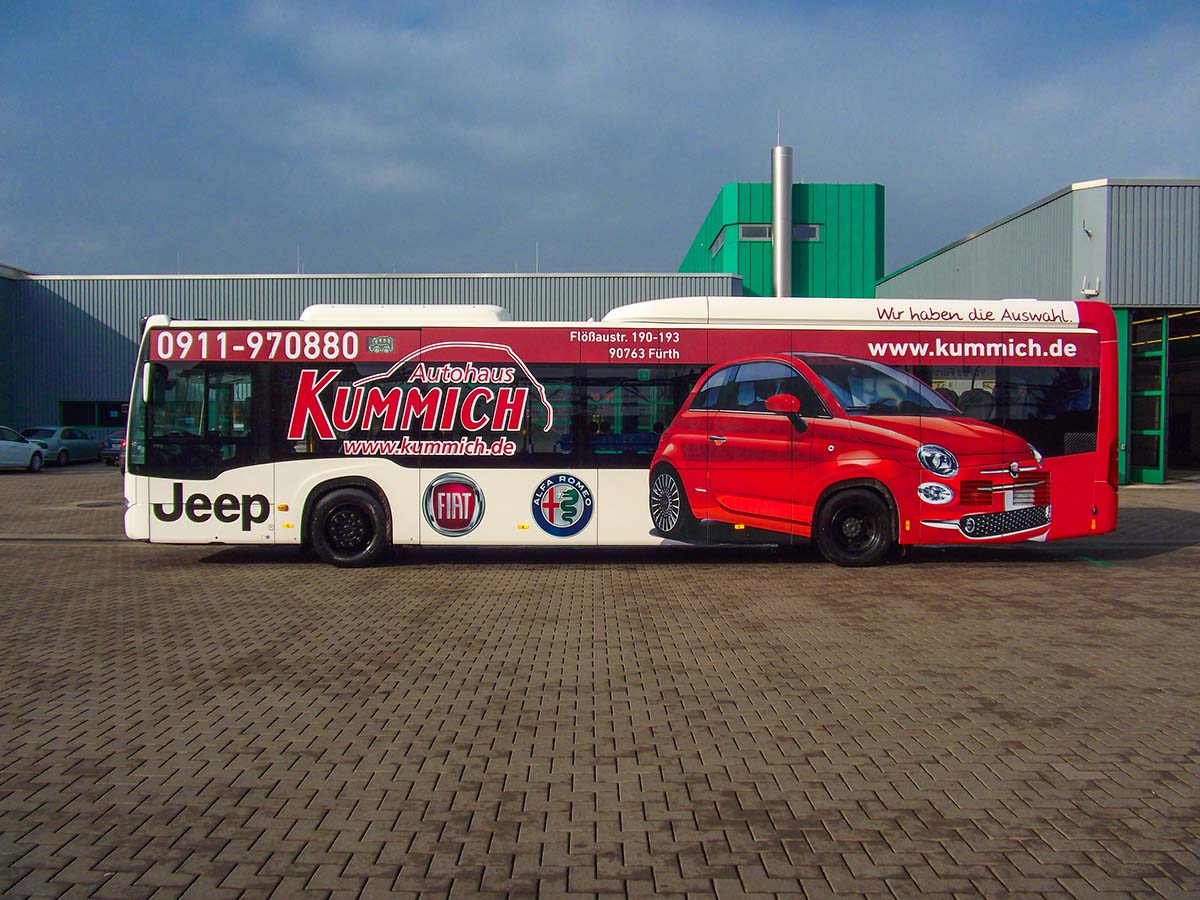 Seit Jahren ist unser Spezialgebiet die Busgestaltung und Beschriftung, insbesondere für den regionalen ÖPNV, der Infra Fürth und den Verkehrsverbund Großraum Nürnberg (VGN). Omnibusmodelle wie MAN, Setra, Mercedes oder Solaris wurden von uns bereits vielfach verklebt. Höchste Qualität der Folien und der Beklebung garantieren eine langfristige Haltbarkeit der Folienbeschriftungen.