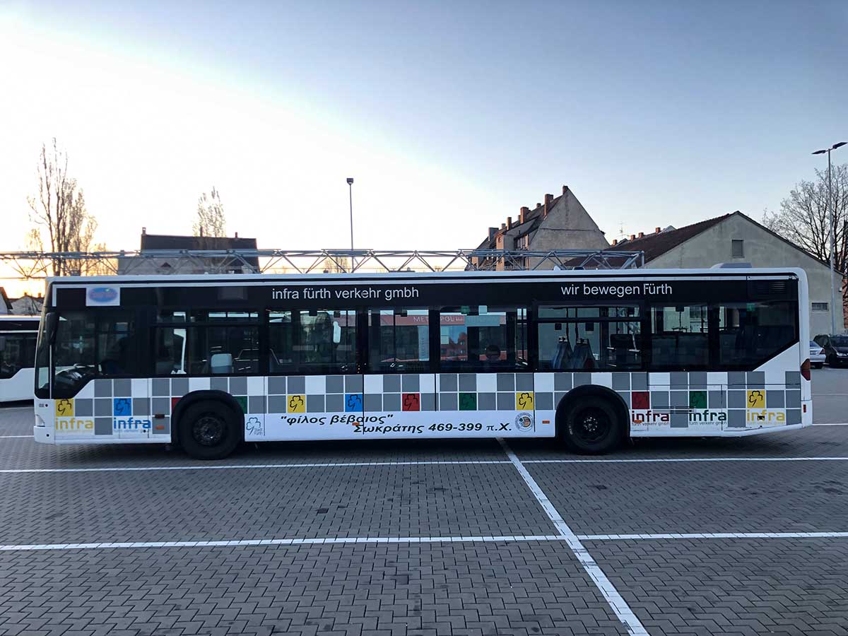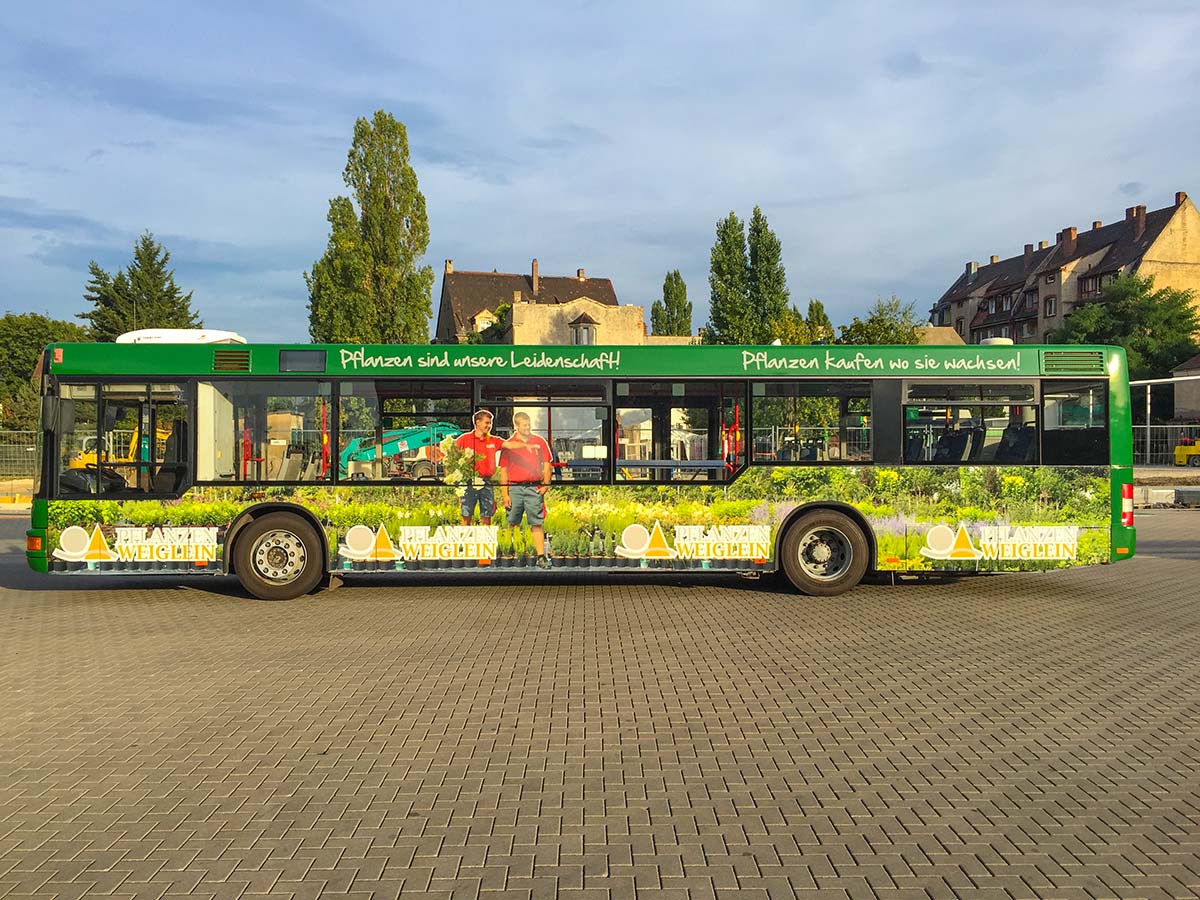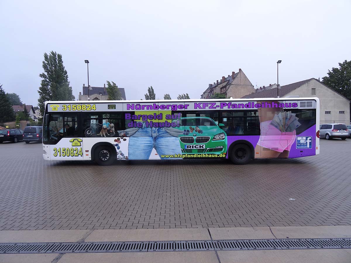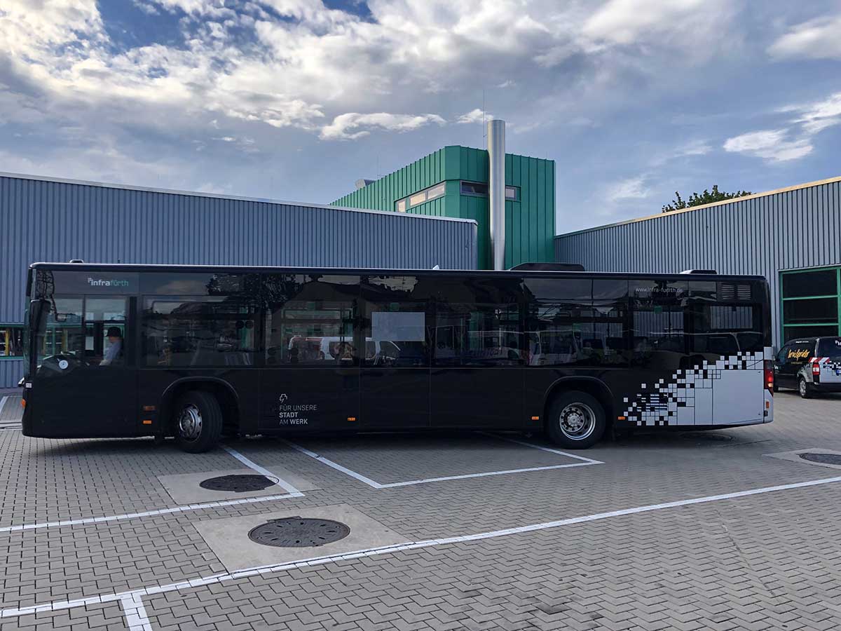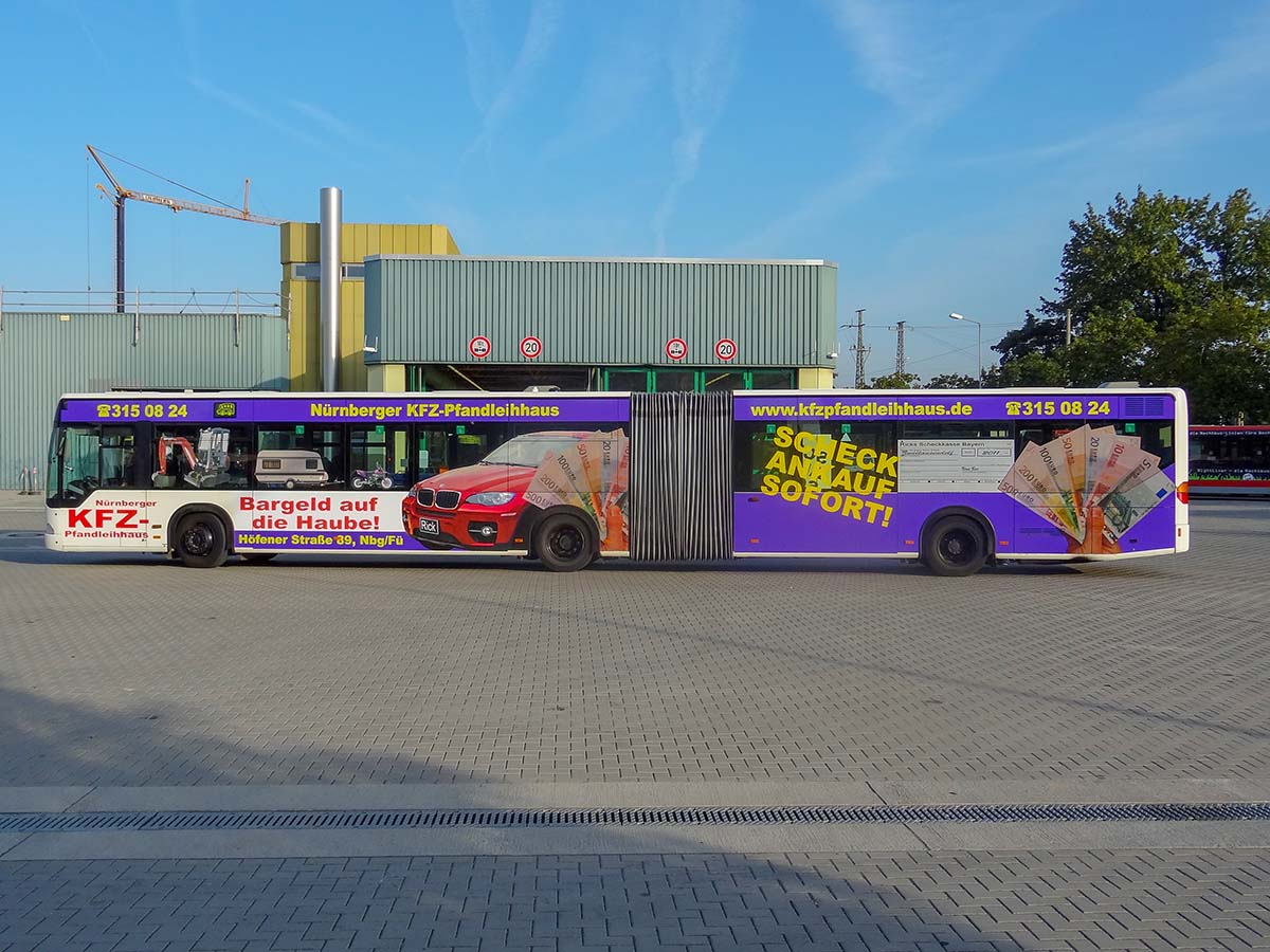 Seit Jahren ist unser Spezialgebiet die Busgestaltung und Beschriftung, insbesondere für den regionalen ÖPNV, der Infra Fürth und den Verkehrsverbund Großraum Nürnberg (VGN). Omnibusmodelle wie MAN, Setra, Mercedes oder Solaris wurden von uns bereits vielfach verklebt. Höchste Qualität der Folien und der Beklebung garantieren eine langfristige Haltbarkeit der Folienbeschriftungen.