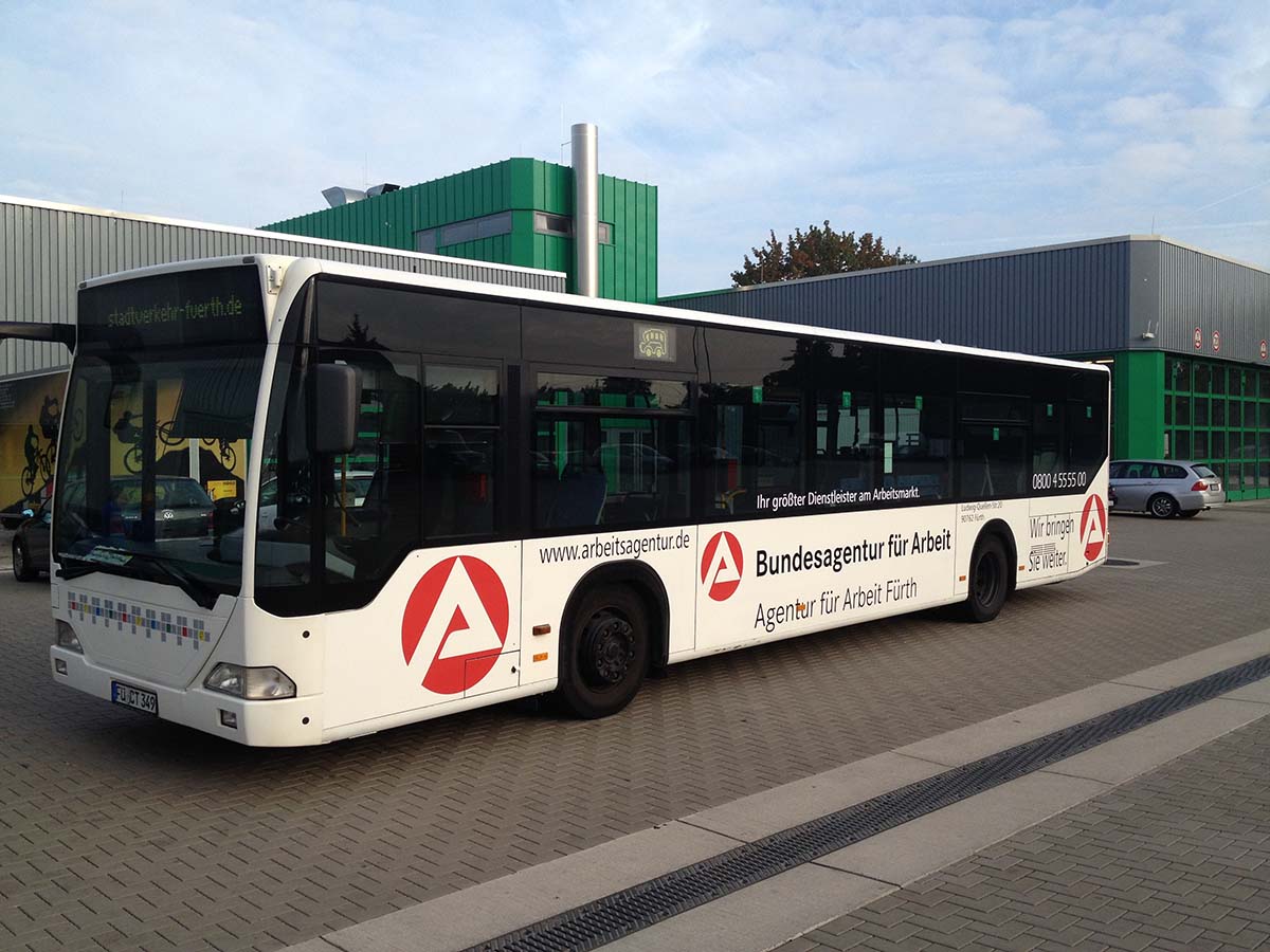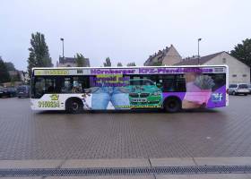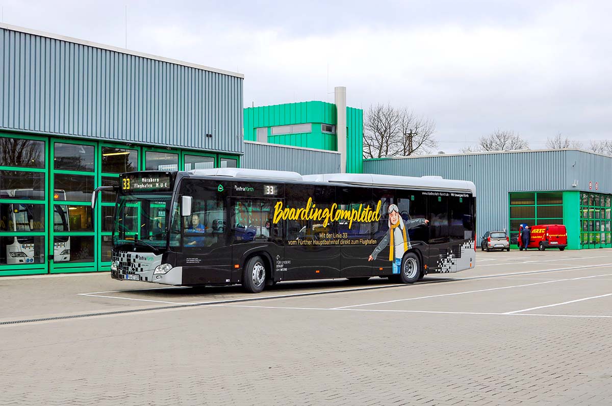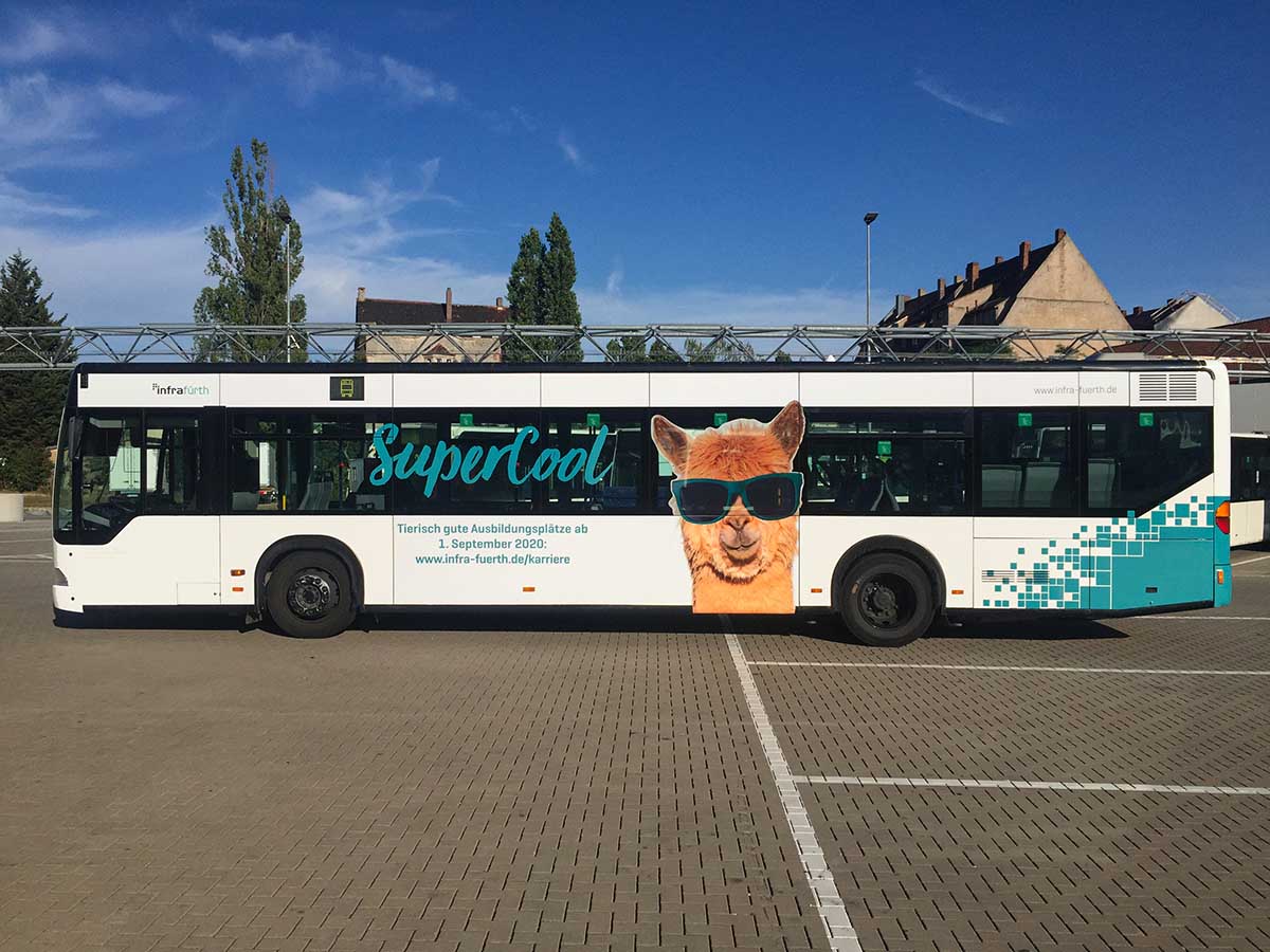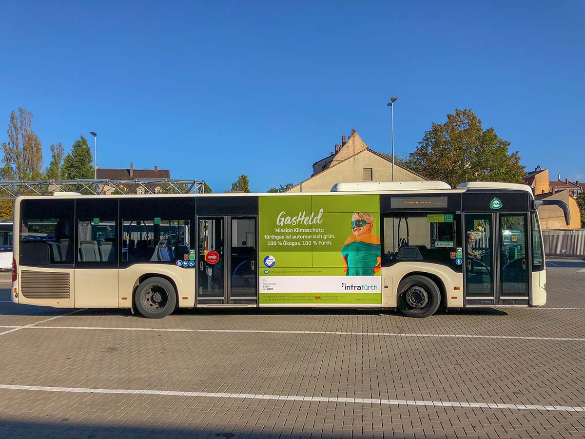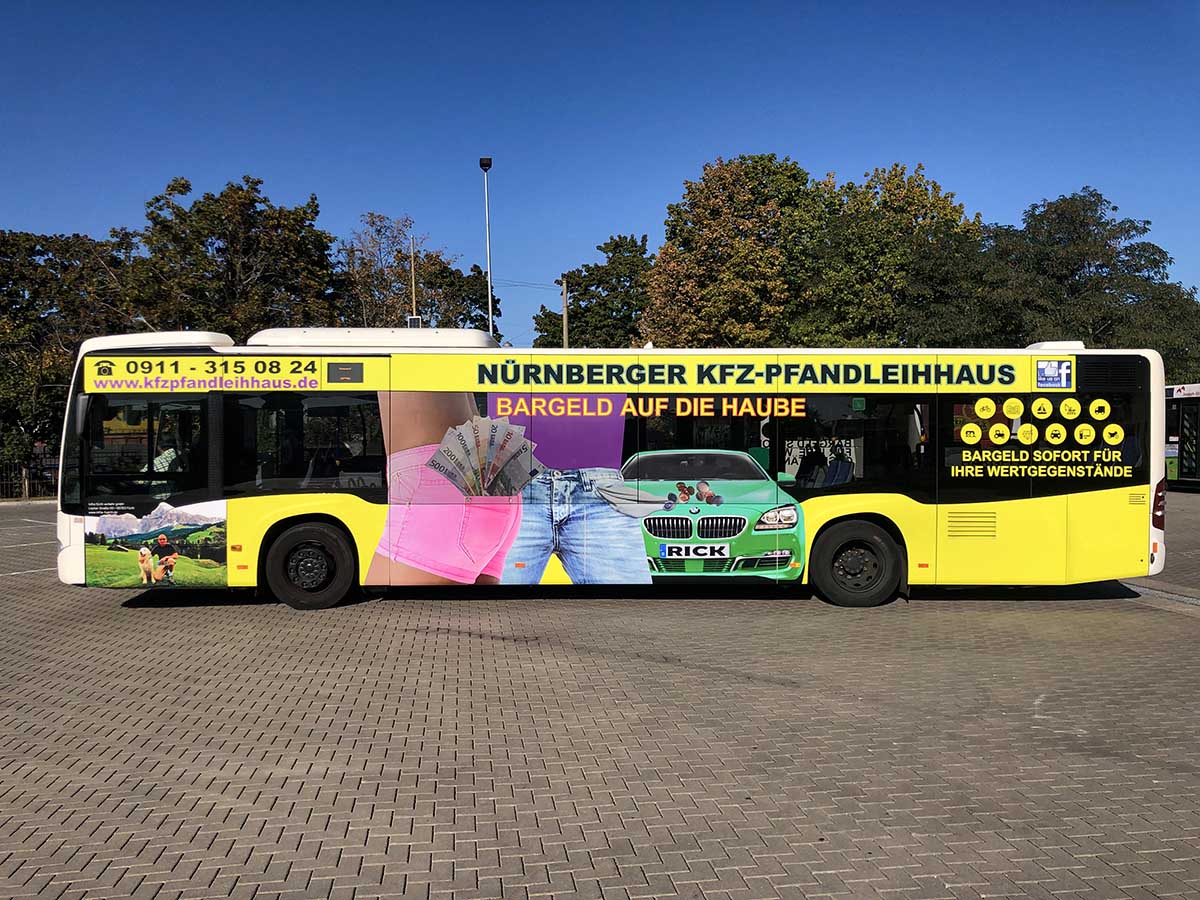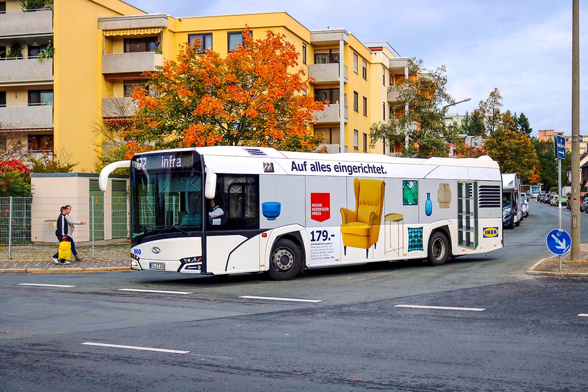Seit Jahren ist unser Spezialgebiet die Busgestaltung und Beschriftung, insbesondere für den regionalen ÖPNV, der Infra Fürth und den Verkehrsverbund Großraum Nürnberg (VGN). Omnibusmodelle wie MAN, Setra, Mercedes oder Solaris wurden von uns bereits vielfach verklebt. Höchste Qualität der Folien und der Beklebung garantieren eine langfristige Haltbarkeit der Folienbeschriftungen.